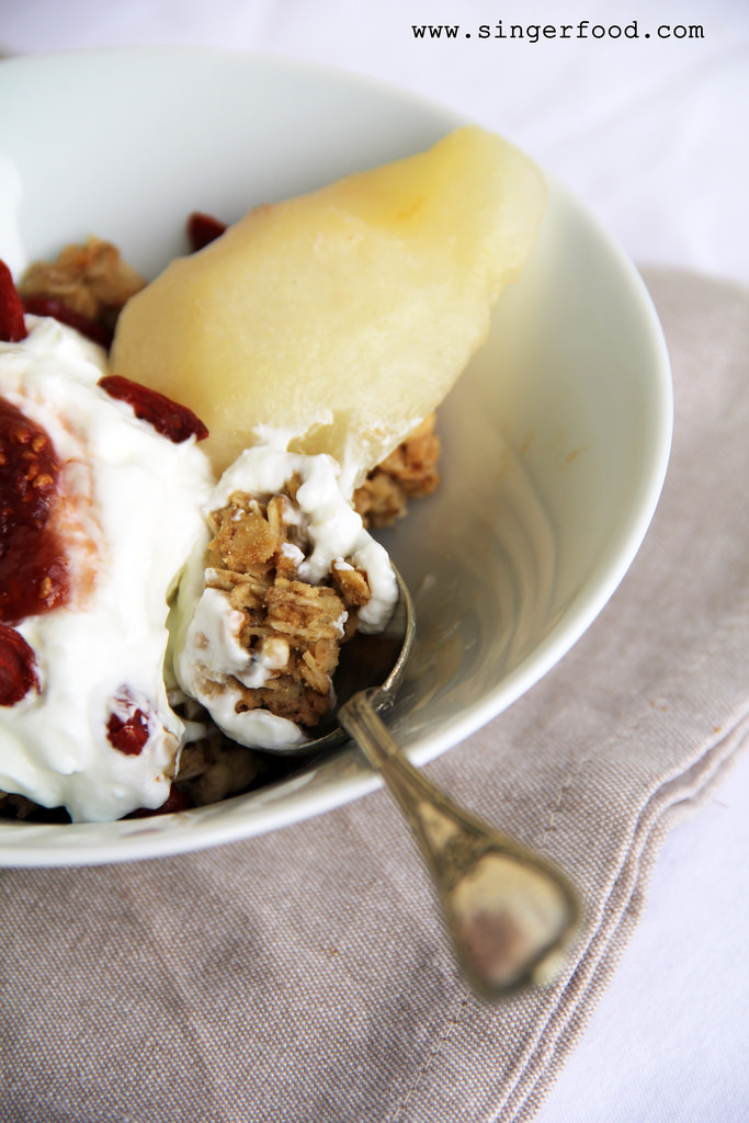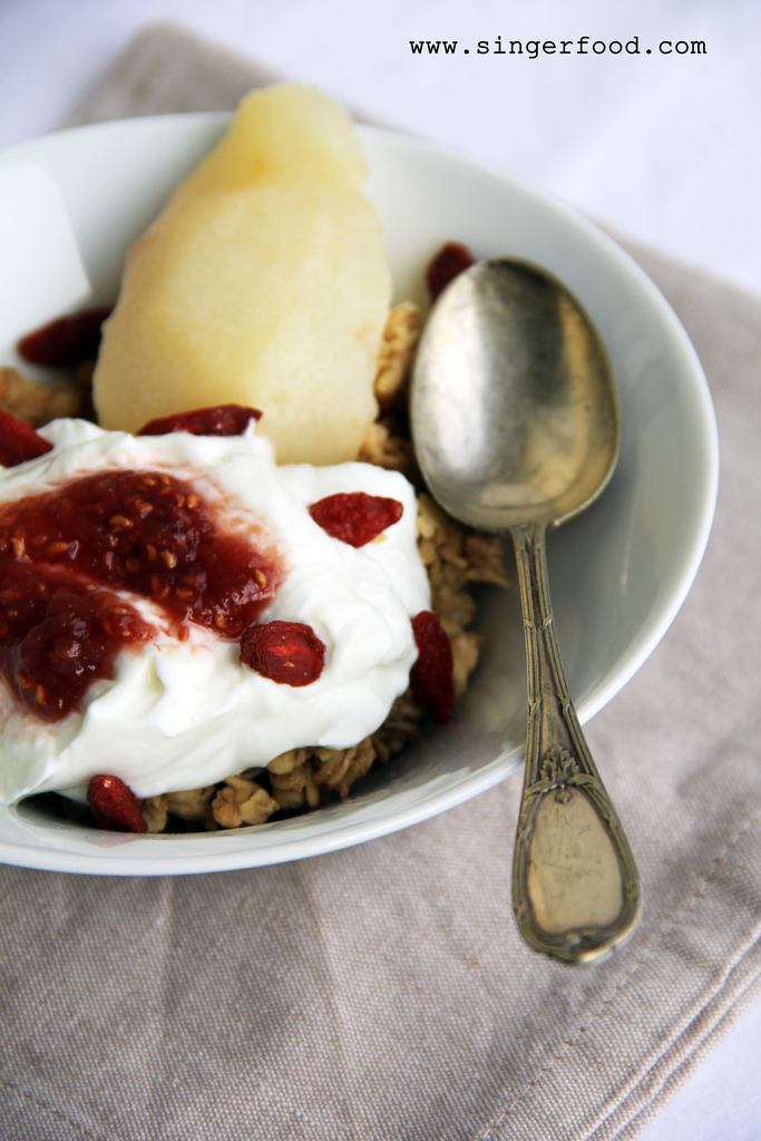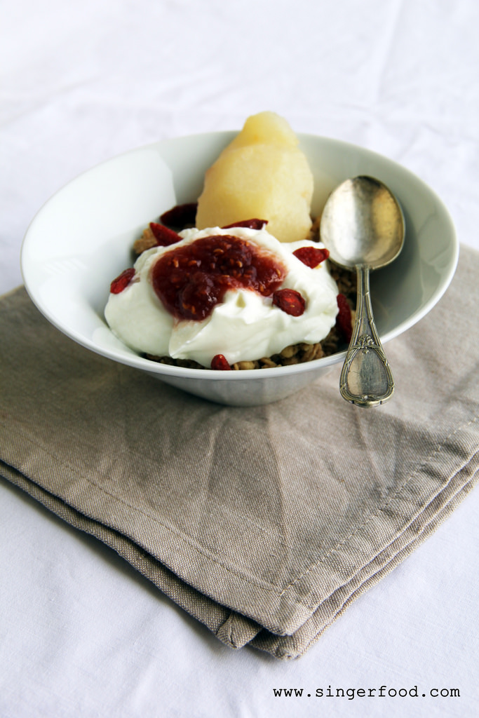 Disponete in una ciotolina la composizione mettendo l’avena sul fondo e aggiungendo poi un abbondante cucchiaio di yogurt, la pera, la salsa di mirtilli e una manciata di bacche di Goji.