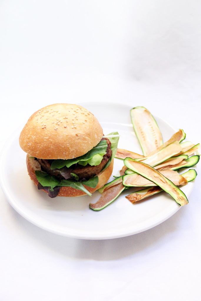 Tagliate i panini a metà, farciteli con l’hamburger e l’insalata condita; disponete a lato le chips di zucchine con un pizzico di sale.