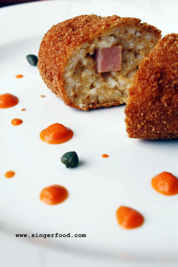 Impiattiamo iniziando con una base di crema di peperoni, un paio di capperi ed il supplì tagliato a metà.