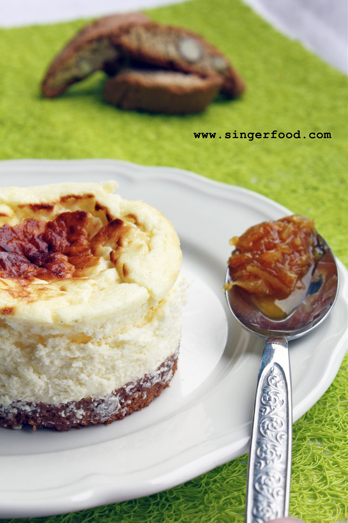 Per preparare il biscotto tritate finemente i cantuccini con un robot da cucina, aggiungete il burro fuso ed un pizzico di sale e mescolate bene. Mettete il composto in uno stampo formando la base della cheesecake e cuocetelo in forno a 180° per circa 7-8 minuti. Una volta cotto lasciatelo raffreddare.