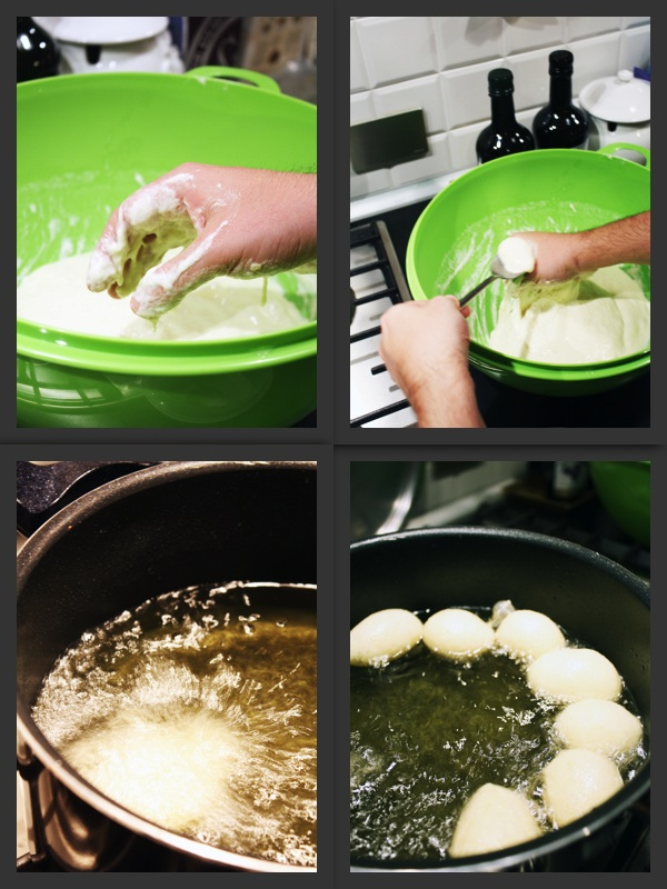 A questo punto procediamo con la frittura. Abbiamo deciso di usare l’olio di arachidi per concederci l’illusione che in questo modo la “frittura sia meno unta”, ovviamente gli integralisti storceranno il naso preferendo l’olio ExtraVergine di Oliva. Siamo aperti al confronto. Prepariamo una coppetta piena d’acqua, servirà per immergere il cucchiaio con cui realizzeremo le sfere da friggere (vedete collage sopra).