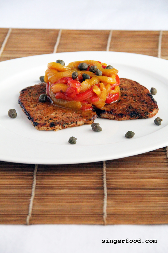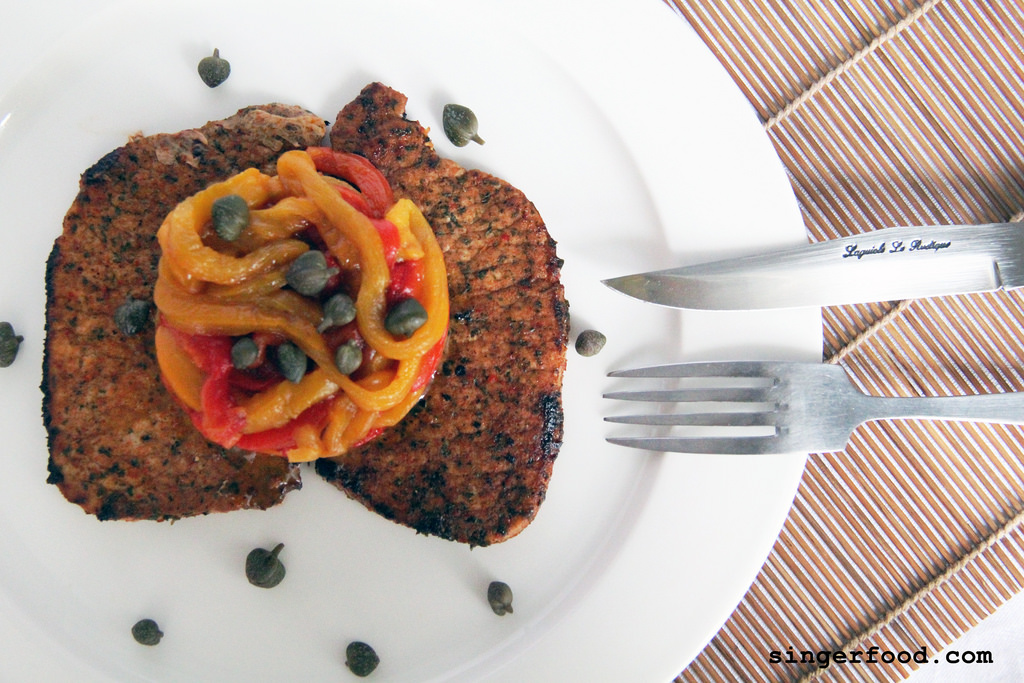 A cottura ultimata impiattate disponendo prima le fettine di lonza ancora calde e dopo i peperoni.