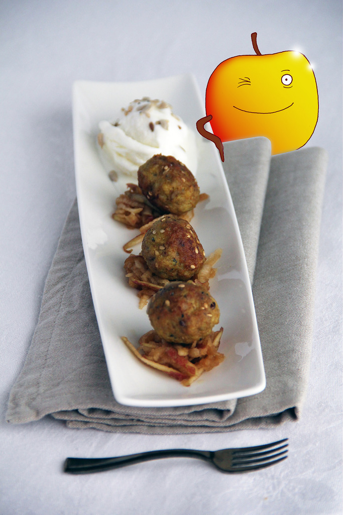 - Componete il piatto disponendo la mela Fuji tagliata a julienne e successivamente le polpettine.
