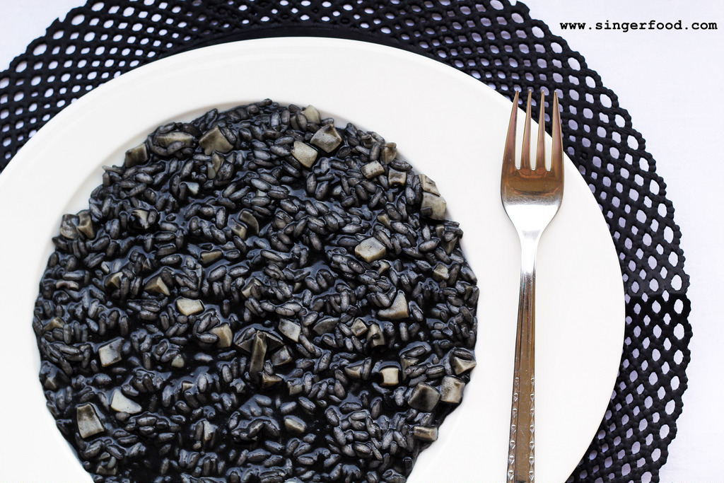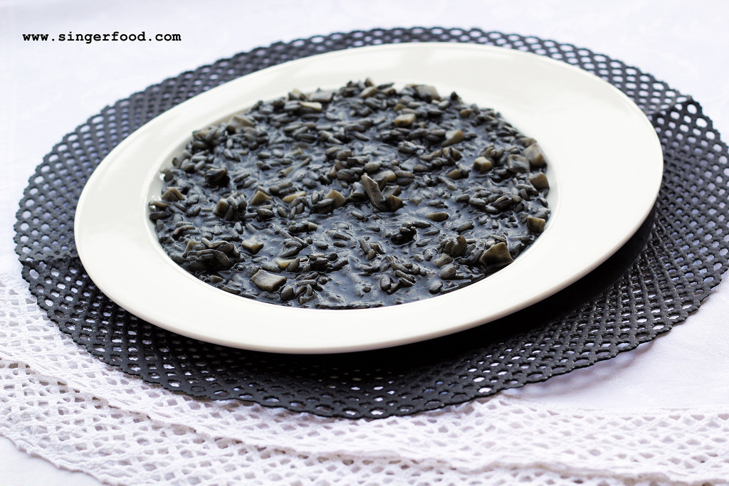 A cottura quasi ultimata ho completato con il nero delle seppie che avevo tenuto da parte, mescolando a velocità 3 per 2 minuti. Ho terminato mantecando con la noce di burro e il Parmigiano Reggiano per 2 minuti a velocità 5. Ho subito servito il risotto ben caldo.