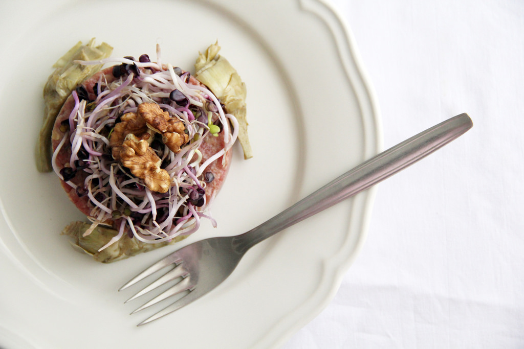 Tartare di manzo alle noci, germogli di ravanello e carciofi sott’olio