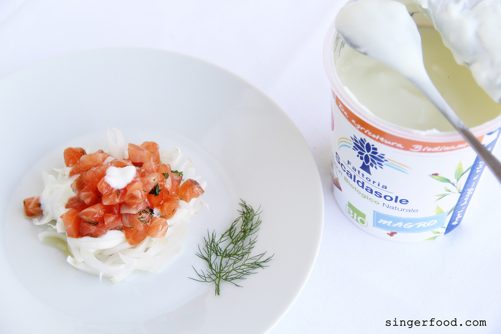 La ricetta di oggi è un “inno” alla remise en forme. Abbiamo immaginato il piatto partendo da un ingrediente preciso: lo Yogurt Magro Fattoria Scaldasole, azienda di cui siamo affezionati consumatori da anni (le nostre colazioni migliori hanno il gusto dello Yogurt alla Vaniglia e di quello al Pistacchio). Una preparazione semplice e fresca, di quelle che diventano una portata unica per pranzo o un antipasto per una cena conviviale.