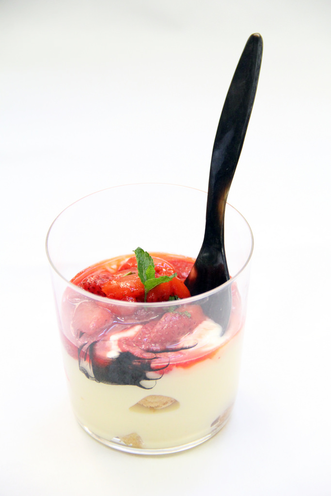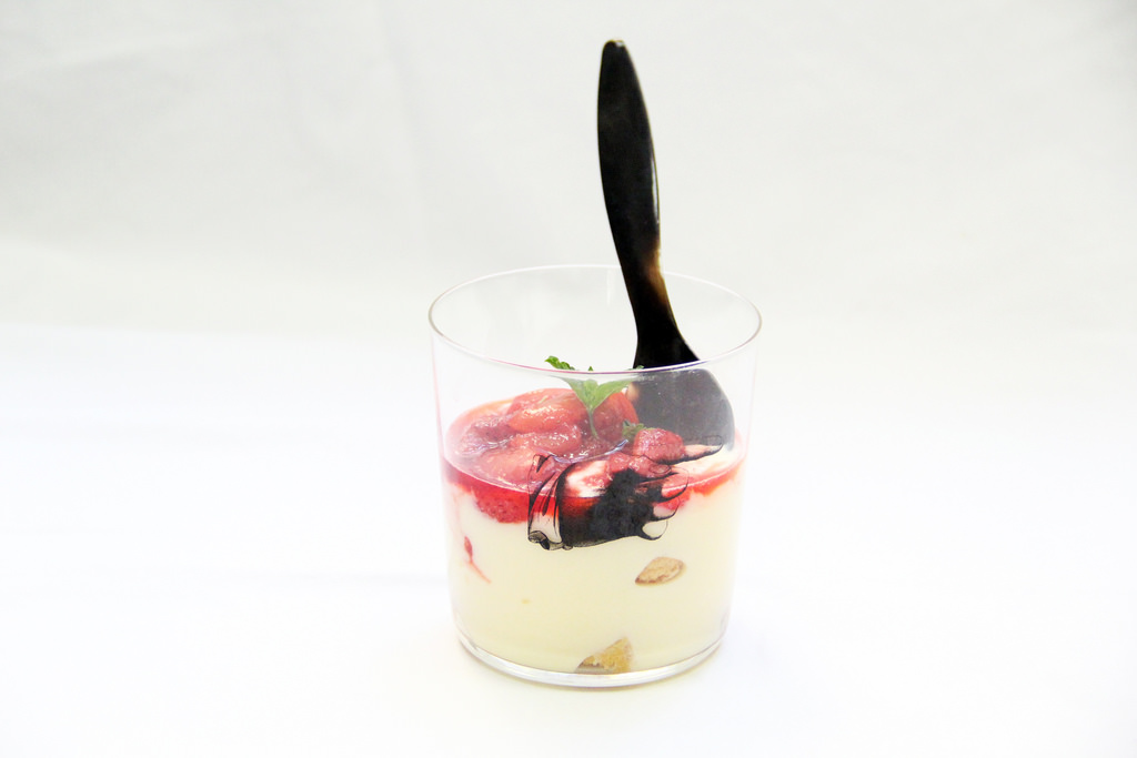 con le fragole, il loro sciroppo e una fogliolina di mentuccia.